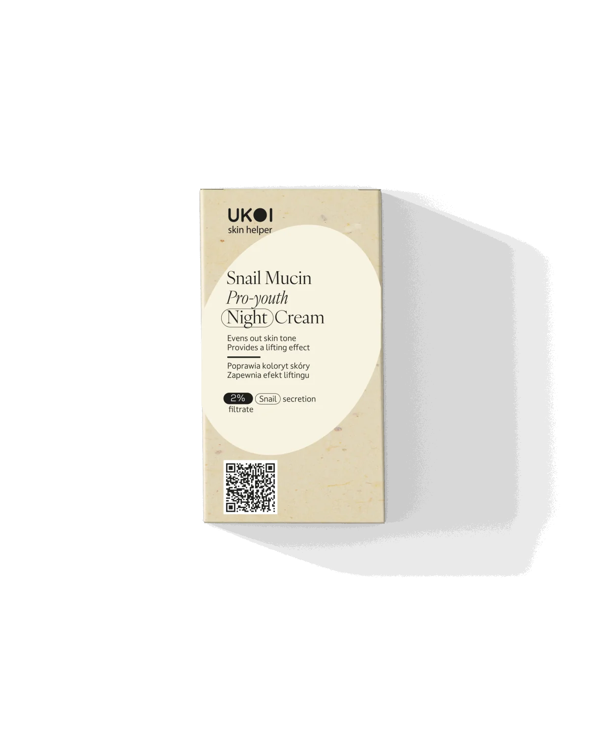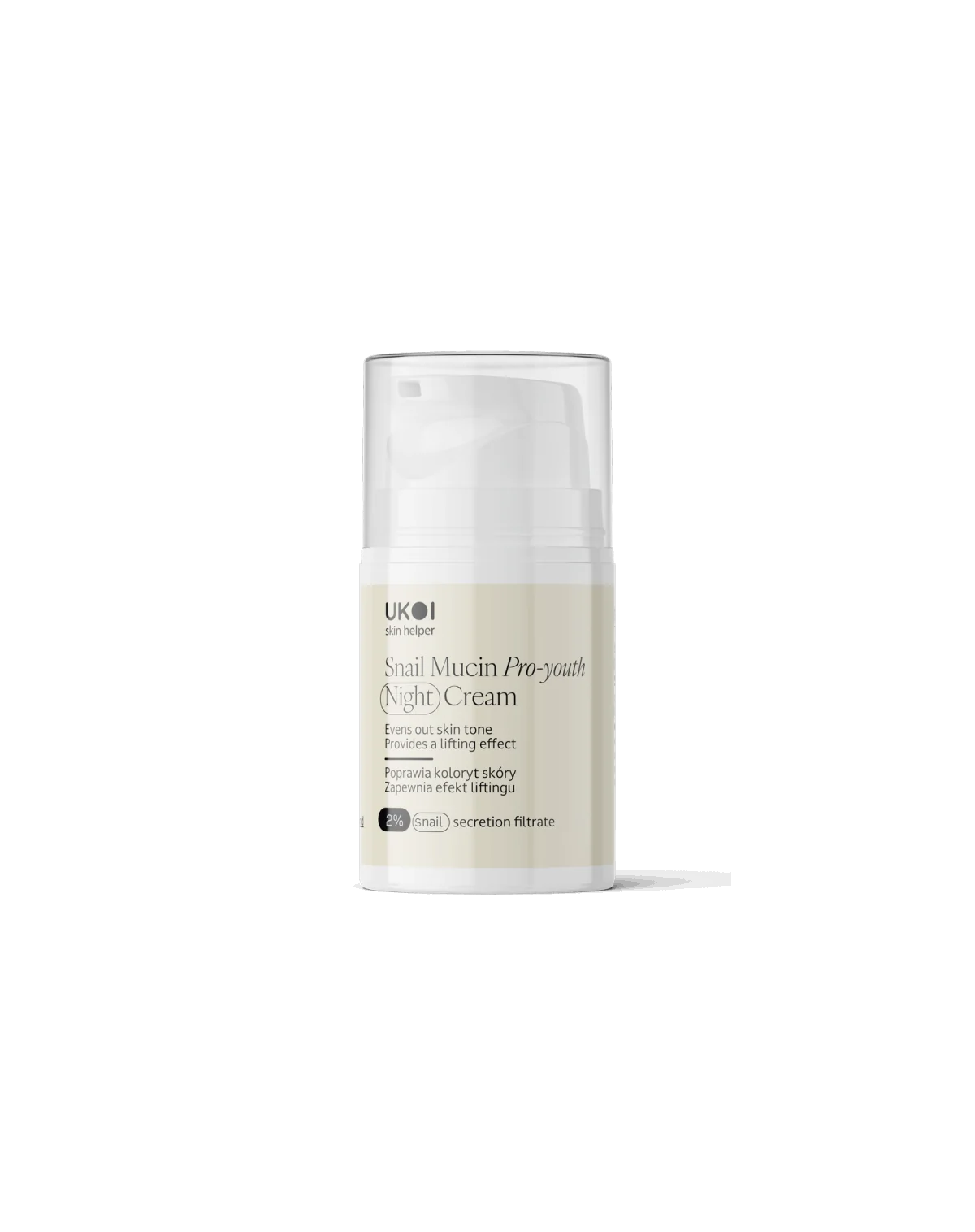 UKOI Snail Mucin Pro-Youth noční krém s hlemýždím filtrátem – vyživující, bohatá receptura krému byla vyvinuta pro intenzivní regeneraci a omlazení pleti během spánku. Obsahuje vzácný filtrát hlemýždího sekretu, který působí na více úrovních – hydratuje, vyhlazuje a podporuje přirozené procesy obnovy epidermis, díky čemuž pleť ráno vypadá odpočatě, svěže a revitalizovaně.